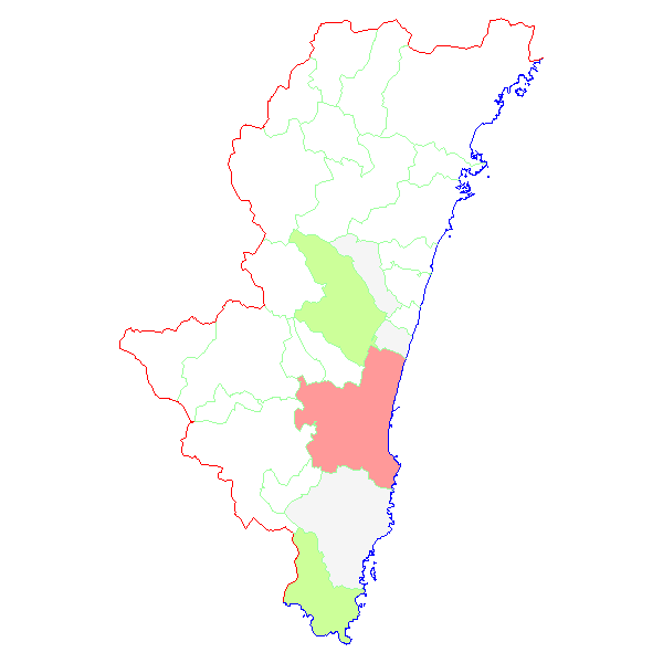 ■ 2013-02-10より2013-02-16までの宮崎県における市町村毎の報告地図